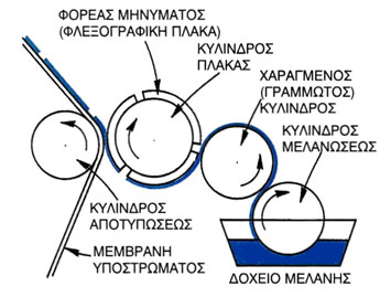 Τα τμήματα της εκτυπωτικής μηχανής που χρησιμοποιείται για φλεξογραφικές εκτυπώσεις, είναι τα παρακάτω: