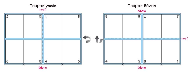 - Αν οι πρώτες τέσσερις σελίδες, όπως φαίνονται στο σχήμα, είναι διαταγμένες έτσι, ώστε με τη φορά του ρολογιού η διάταξή τους να είναι αύξουσα, τότε οι επόμενες τέσσερις έχουν αύξουσα διάταξη αντίθετα από τη φορά του ρολογιού.